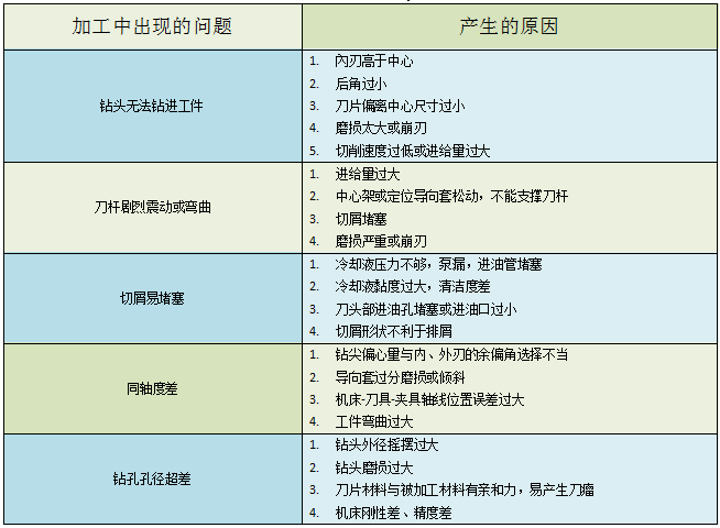 6. 槍鉆加工中常遇到的問(wèn)題和產(chǎn)生的原因見(jiàn)下表: