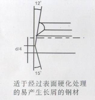 減小槍鉆內(nèi)、外刃角度,即槍鉆內(nèi)外刃磨的更平一些,對加工斷屑有很大的   幫助。另外,切削線速度的提高,對斷屑效果也很明顯。加工不易斷屑材料   時(shí),槍鉆端刃可以參考如下角度: