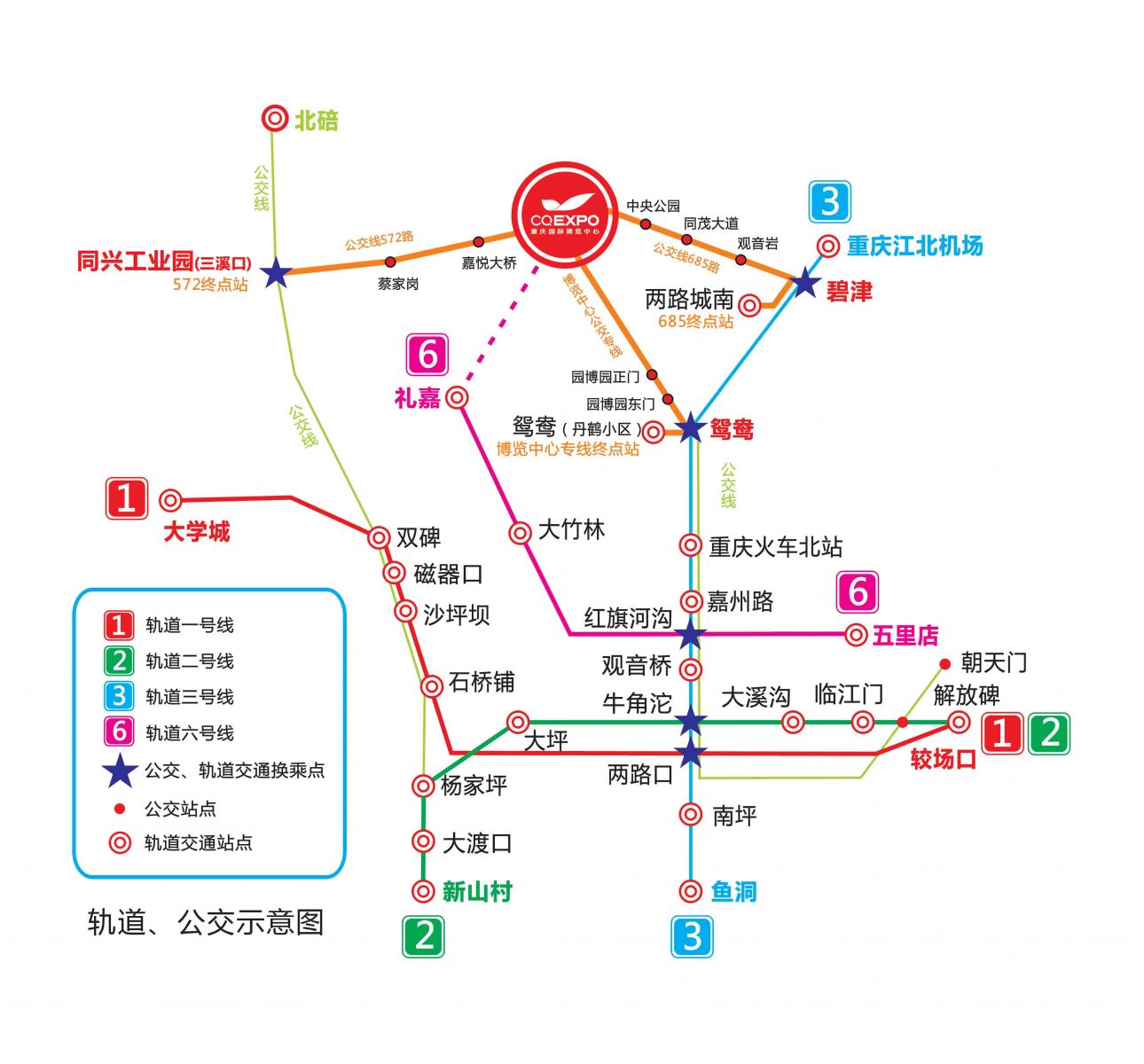 1. 乘坐博覽中心專線至【軌道鴛鴦?wù)尽繐Q乘軌道交通3號(hào)線至【兩路口】換乘軌道交通1號(hào)線至【沙坪壩】