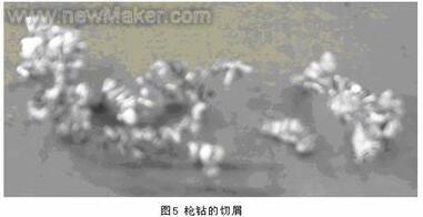 試驗(yàn)十分成功,切削輕快、平穩(wěn),冷卻充分、切屑呈銀白色、短螺旋卷曲(見圖5),排出順利,效果良好。