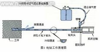 高壓冷卻霧化裝置是整個(gè)槍鉆系統(tǒng)關(guān)鍵的一個(gè)系統(tǒng),它在加工過(guò)程中起到潤(rùn)滑、冷卻、排屑的作用。輸入系統(tǒng)的壓縮空氣一部分驅(qū)動(dòng)脈沖泵形成噴霧,另一部分空氣連續(xù)驅(qū)動(dòng)活塞泵,通過(guò)雙路管線和高流量噴霧裝置加壓給切削液,將切削液輸送至鉆頭切削區(qū),被霧化后的切削液吸收切削區(qū)的熱量,冷卻、潤(rùn)滑槍鉆刀頭,并將切屑強(qiáng)制吹出工作物外。