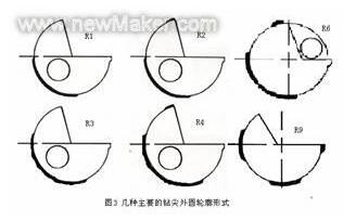 鉆刃是整個(gè)槍鉆的關(guān)鍵部分,其獨(dú)特科學(xué)的組合結(jié)構(gòu)保證在完成切削工作同時(shí)還起到自導(dǎo)向的作用, 可以通過(guò)一次貫穿得到一個(gè)高精度的深孔。鉆刃有兩個(gè)基本度,可以根據(jù)被切削工件的材料及形式來(lái)選擇最恰當(dāng)?shù)慕M合,以便于工作更好的平衡切削力和斷屑,并將切削力傳遞給支撐凸肩,保證良好的直線度和同軸度。鉆刃有很小的倒錐度并且直徑較刀身略大,可以保證鉆身可以在切削孔內(nèi)自由旋轉(zhuǎn)而不會(huì)磨擦孔內(nèi)壁的切削表面,根據(jù)不同要求,刃部有單圓孔、腎型孔和雙圓孔的通道同刀身的油道連接,高壓的冷卻液可以通過(guò)此通道到達(dá)切削點(diǎn),并將切屑帶出工件。鉆刃支撐的幾種主要的外圓輪廓形式(見圖3):