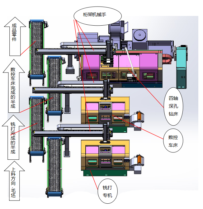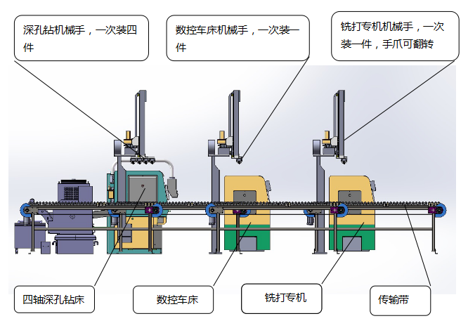 該生產(chǎn)線(xiàn),將凸輪軸銑打兩端頭專(zhuān)機(jī)、數(shù)控車(chē)床專(zhuān)機(jī)和深孔鉆機(jī)床有機(jī)結(jié)合,共用一條桁架機(jī)械手裝卸工件。成流水線(xiàn)式排列。三道工序組成一個(gè)加工模塊,工序間的物流轉(zhuǎn)移都由桁架機(jī)械手完成。使凸輪軸粗加工效率發(fā)揮至最大,人工降至最少。提高了加工效率,降低了生產(chǎn)成本。